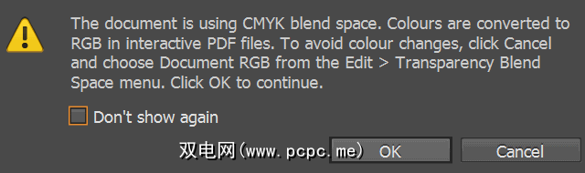 对选项满意后,单击确定即可导出交互式PDF。如果您未在“编辑">“透明混合空间" 菜单中设置“文档RGB"选项,则会显示一条警告,提示您从CMYK转换为RGB。如果输出的电子杂志有颜色问题,只需在启用此选项的情况下重复导出即可。