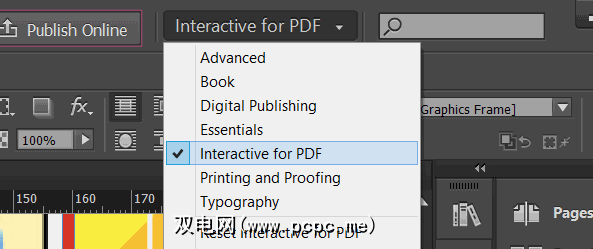 打开PDF文件后,您需要准备好使用多媒体,交互式元素进行增强。为此,请将搜索框旁边的下拉菜单从默认设置切换为交互式PDF 。这将引入一个新的工具集合,您将在InDesign窗口的右下角看到它们。