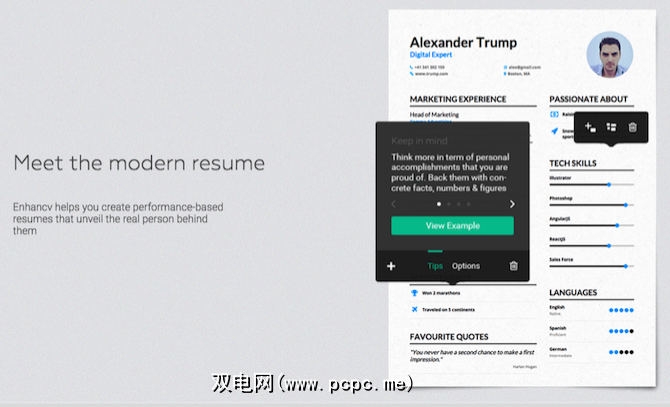 由Enhancv创建的极其可定制(免费)的简历将您基于文本的旧简历变成更加直观的东西。在您添加简历时,将弹出招聘专家的相关建议,以确保您添加的内容尽可能有效。