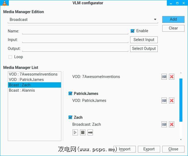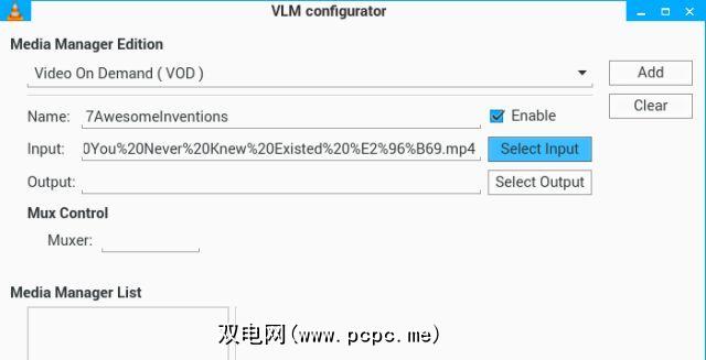 您在此处看到的VLM Configurator工具可以非常轻松地传输内容。您所要做的就是添加“输入"媒体(例如,MP4视频或MP3音频文件),并使用特定名称将其添加到“媒体管理器"列表中。
