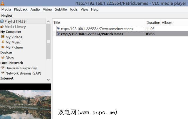 vlc -vvv --color -I telnet --telnet-password <password> --rtsp-host 0.0.0.0 --rtsp-port 5554用您选择的密码替换 这将在命令窗口中滚动一整堆文本。而且也不必担心任何错误(这可能意味着您单击了VLC中的某些设置无法正常工作-重要部分是通过您刚刚启动的命令正确设置的。 命令启用telnet,但是现在您需要加载刚刚创建的VLM配置文件,以正确启动所有媒体文件的网络流传输。 使用 Ctrl- Alt-T ,然后导航到存储媒体文件的文件夹(在我的情况下是我的Documents文件夹)。一旦到达,请使用以下命令连接到端口4212上新创建的telnet服务器(telnet默认) : 键入您在上面创建的密码登录。 然后键入: 用在上面创建的导出的VLM文件的名称替换。当您导出媒体文件列表时,在我的情况下是PlayList2.vlm(请记住,这是Linux,所以区分大小写)。 您应该看到“负载"的响应。 That’s it, your media server is now fully configured with the entire list of media files you’ve loaded, now available for streaming using any client on the same network. 让我们来看看如何第一次设置它们。 在您的每个客户端上,无论是Windows,Mac还是Linux PC,甚至是移动设备,都将以相同的方式从新的VLC流服务器打开流。 您只需要一次建立可用媒体的客户端库。之后,GUI会维护所有这些库,您可以随时查看它们。 首先,在客户端设备上打开VLC GUI。然后,在菜单中单击媒体,然后选择打开网络流… 在“打开媒体"窗口中,填写字段请输入带有服务器IP地址的网络URL ,包括端口5554,并以“ rtsp://"开头。 以另一个字符串结尾斜杠和媒体名称(在上面创建媒体流列表时提供的名称)。因此,例如,对于我为其添加了流的Patrick James的音乐视频,我的字符串将如下所示: …我给它的媒体名称为“ PatrickJames"。 如果您不知道服务器的IP,请返回Linux计算机,打开命令提示符( Ctrl-Alt-T ),然后输入“ ifconfig "。将会提供当前的IP地址。 如果您的Linux服务器还不是静态的,您可能需要考虑分配一个静态IP地址。或者,如果有点太复杂,只需像Justin一样使用DynDNS –这是一个非常聪明,简单的解决方案,实际上甚至可以让您在自己的家庭网络之外流式传输媒体。 这将启动视频或音频流。要将更多流添加到库中,只需返回VNC GUI,打开另一个流,然后在末尾键入带有新媒体名称的相同URL。重复进行,直到将它们全部加载到该客户端的库中。 要查看该库,只需单击视频播放器窗口底部导航栏中的菜单,然后导航面板将打开剩下。 “播放列表"将显示您已加载到流媒体的所有视频。 如您所见,VLC播放器看起来很棒,PCPC.me上有许多媒体流媒体盒,用于观看互联网内容这些天在电视上通常还包括VLC流媒体选项。只需在此处使用相同的URL,就可以了。 以下是Linux VLC流服务器上的内容,该内容是在Android上使用Android VLC在Android上播放的。 由于VLC是在各种设备上如此司空见惯,无论使用什么设备,您都可以从任何地方访问您不断增长的媒体库。 那里有很多媒体中心解决方案就像Plex一样。但是其中只有少数几个具有如此强大的基于命令的解决方案,可让您以如此简单的步骤就可以流式传输所有本地保存的个人媒体。 您是否使用VLC满足流式传输的需求?您最喜欢VLC的哪些功能? 在下面的评论部分中分享您自己的经验和看法。让我们讨论一下本地网络上的流媒体!telnet localhost 4212load .vlm设置VLC流客户端
