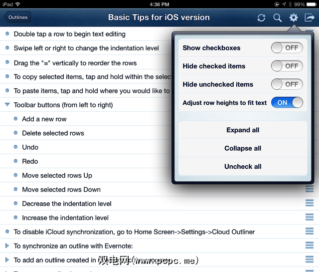 通用的iOS应用程序($ 4.99)允许Evernote和iCloud同步,而Cloud Outliner的移动版本与Mac版本非常相似。