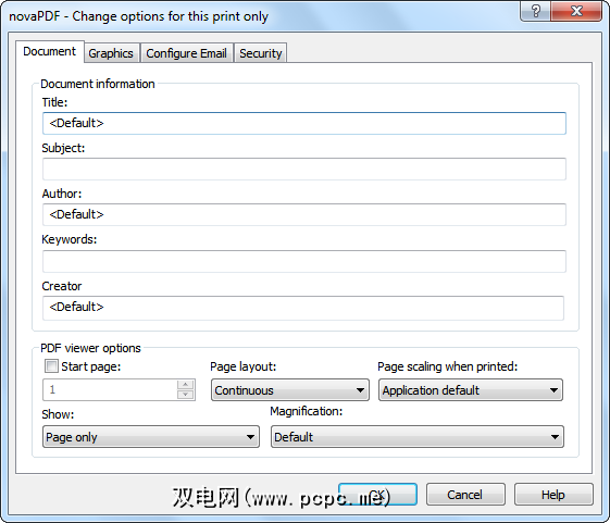 单击更改选项按钮以调整当前PDF打印操作的设置。您可以设置标题,主题,作者和关键字-如果您在线发布PDF,则特别有用,因为这些字段将被搜索引擎索引。您还可以更改PDF查看器在打开PDF文件时将使用的默认选项-例如,您可以在特定页面上自动打开PDF。其他选项卡允许您更改图形压缩设置以及通过电子邮件发送PDF时将使用的电子邮件服务器。