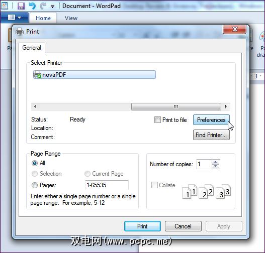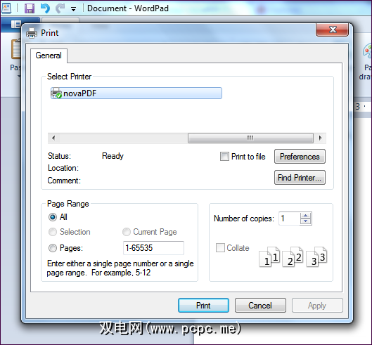 打开任何应用程序的“打印"窗口,您将看到novaPDF可作为其中一台打印机使用。您甚至可以将其设置为默认打印机。