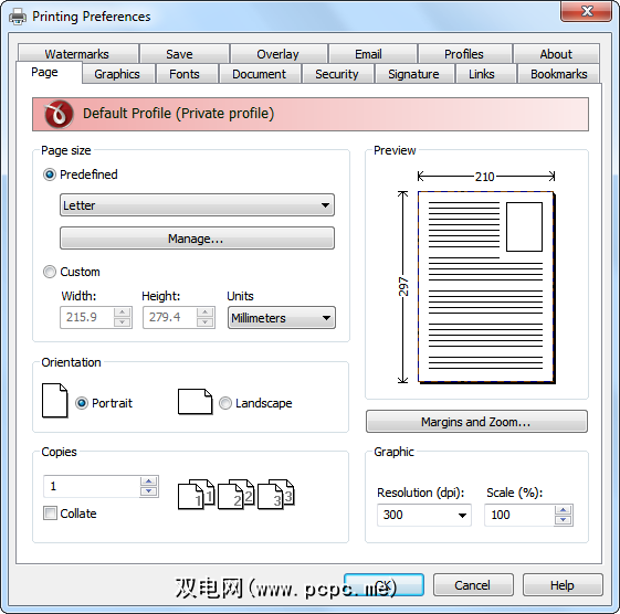 NovaPDF还包括对配置文件的支持。如果您要使用不同的设置组,则可以为每个创建一个配置文件。 NovaPDF还可以在打印时显示“选择配置文件"对话框,因此您可以快速选择设置组,而无需在首选项对话框中来回调整设置或在配置文件之间切换。