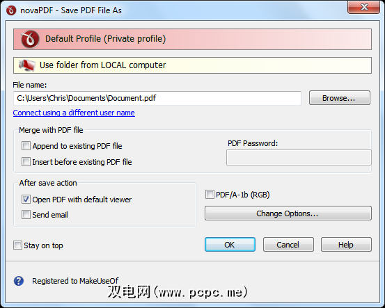 使用novaPDF打印机进行打印,您将看到novaPDF保存对话框,该对话框可让您调整设置。默认情况下,novaPDF将创建一个新的PDF文件,然后使用您的默认PDF查看器打开它。在这里,您还可以让novaPDF将文档添加到现有PDF文件的开头或结尾,为PDF文件应用密码,或通过电子邮件发送PDF文件-PDF可以自动通过电子邮件发送或附加到系统默认电子邮件客户端中的电子邮件。您也可以单击PDF / A-1b复选框来创建PDF / A文件。 PDF / A是专为长期归档而设计的PDF标准-例如,它在系统中嵌入字体而不是链接到字体,并且不允许使用将来可能妨碍查看的密码。