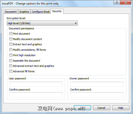 在“安全性"选项卡上,您将找到加密,密码和权限设置。 。权限复选框使您可以控制用户是否可以使用PDF打印,修改和执行其他操作。您可以设置不同的用户密码和所有者密码-当有人使用用户密码打开PDF时,他们将无法调整文档权限。