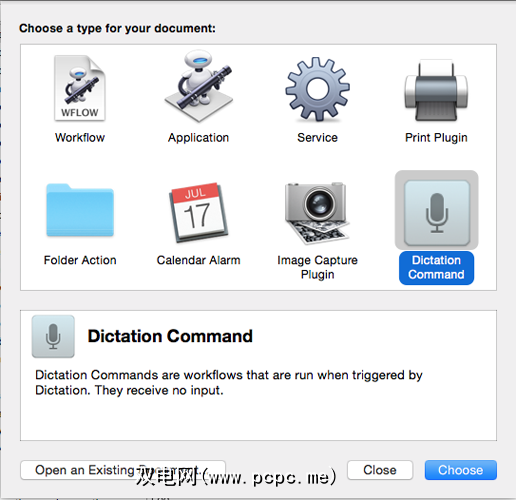 要创建自定义可发音项,请启动Mac的Automator应用程序(默认情况下已与OS X一起安装)。系统会询问您要将新宏保存在何处,在下面的窗口中,选择“听写命令"。