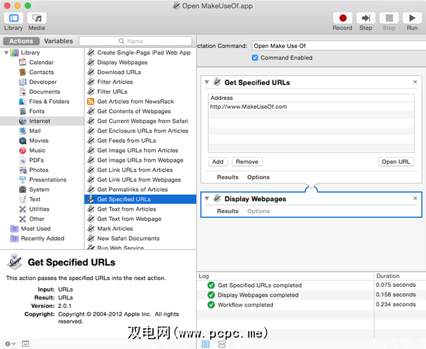 用PCPC.me地址替换当前默认地址,然后选择 Display Webpages 操作并将其拖到工作流程的下一阶段。要测试工作流程,可以单击工具栏右上方的 Run 按钮。