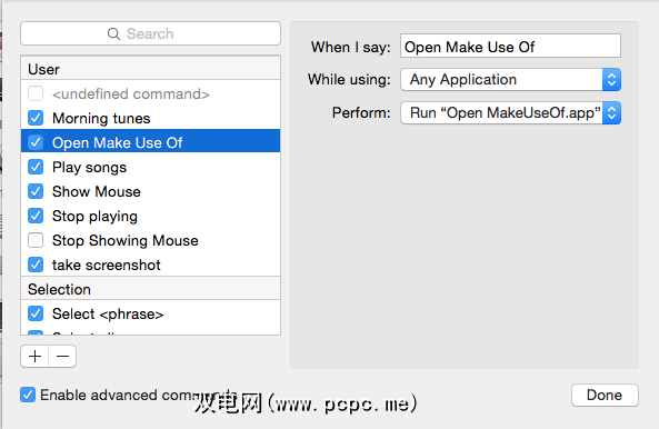 在屏幕顶部,您可以为工作流程分配口授命令-我要使用“打开使用"。选中已启用命令框,然后保存宏。您现在应该能够说出并触发您刚刚键入的命令,并且可以说出的项目也应该列在系统偏好设置的 Dictation 窗格中。