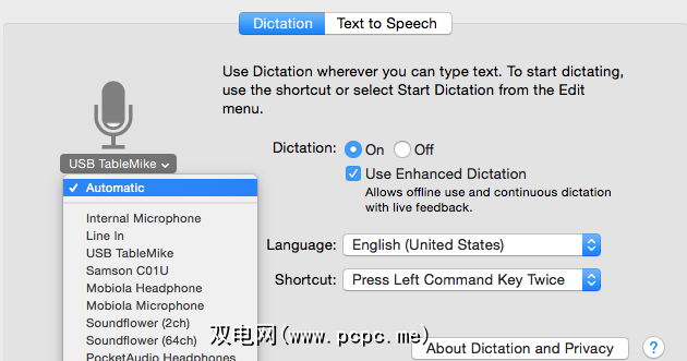 要使用新的语音命令功能,您首先需要打开系统偏好设置>听写,并启用Mac的听写功能。默认情况下,系统会在Mac上选择内部麦克风,但您可以选择(在麦克风图标下方)其他外部麦克风以获得更好的性能。