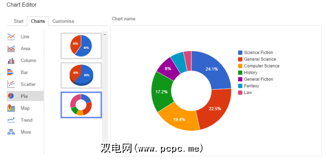 它提供了八种主要的图表类型 –线,面积,列,条形图,条形图,散点图,饼图,地图和趋势图。可以通过更改大小,方向和编辑颜色来进一步自定义这些样式。