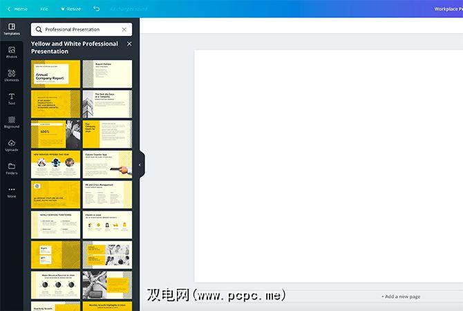点击演示文稿后,您将被带到空白工作区。像所有Canva的工作区一样,您会在左侧看到一组预制模板。