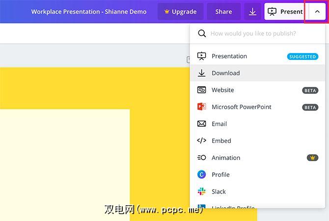 演示文稿一旦完成,就可以开始了。下载。要下载您的演示文稿(或以其他格式使用),请点击当前按钮旁边的下拉菜单。