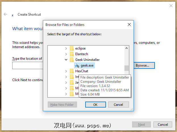 这将使用默认名称创建一个空快捷方式(“新建快捷方式"),并弹出创建快捷方式向导您完成整个过程。首先输入要使用此快捷方式启动的程序的位置,或使用浏览按钮自己找到它: