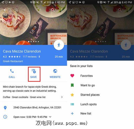 搜索要添加到第一个列表中的位置,然后点击保存按钮。您可以从现有列表(“收藏夹",“想要去"和“加星标的地方")中进行选择,也可以创建新的个性化列表。