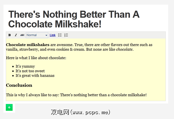 单击底部的绿色加号图标可向页面添加更多元素。在这里,您可以添加更多文本,图像,视频,音频片段,链接,地图等。您也可以添加CheckThis应用进行民意测验和付款,我们将很快进行介绍。大约2分钟后,我创建了此[不再工作]页面,现在我可以轻松地与您分享该页面。