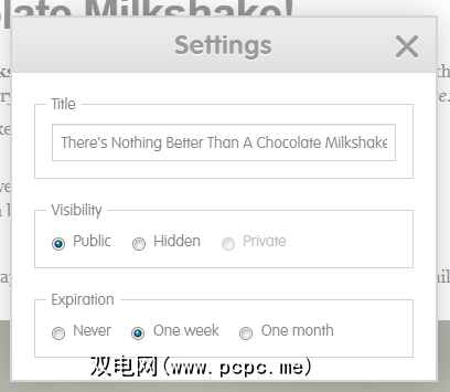 单击齿轮可访问页面设置。在这里,您可以选择页面是公开页面还是隐藏页面(只有知道链接的人才能看到它),以及是否希望它在一定时间后过期。如果选择从不,则始终可以通过个人资料手动删除页面(如果已登录)。
