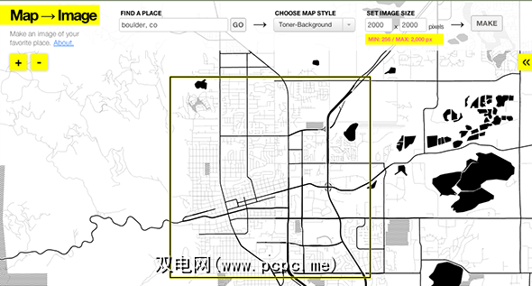 前往Map to Image的网页,您可以立即开始使用。首先输入要绘制地图的地点的名称,然后开始调整设置: