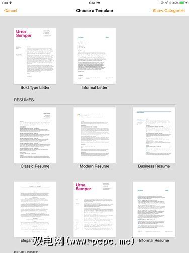 如果要更多控制简历的内容和布局,iPad的Pages的最新版本以及Mac的Pages包括六个经过专业设计的经典,商务和非正式模板,以及与之匹配的求职信,这些内容与上一版本相同iOS页面。集合中没有示例CV模板,但可以为此目的修改简历模板。