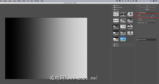假设您要使此半色调纹理“更大"。为此,请转到过滤器库右侧的尺寸栏,在此处以红色显示。