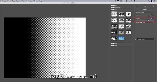 要查找半色调图案,请转到滤镜库内的素描>半色调图案。这将自动在图像上应用半色调,但是如您所见,如果不对其进行自定义,它不会增加太多。