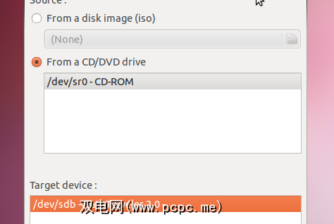 启动该程序,您会看到一个与UNetBootin不同的界面,UNetBootin是用于创建Linux可引导USB驱动器的类似工具。您需要选择来源和目的地。