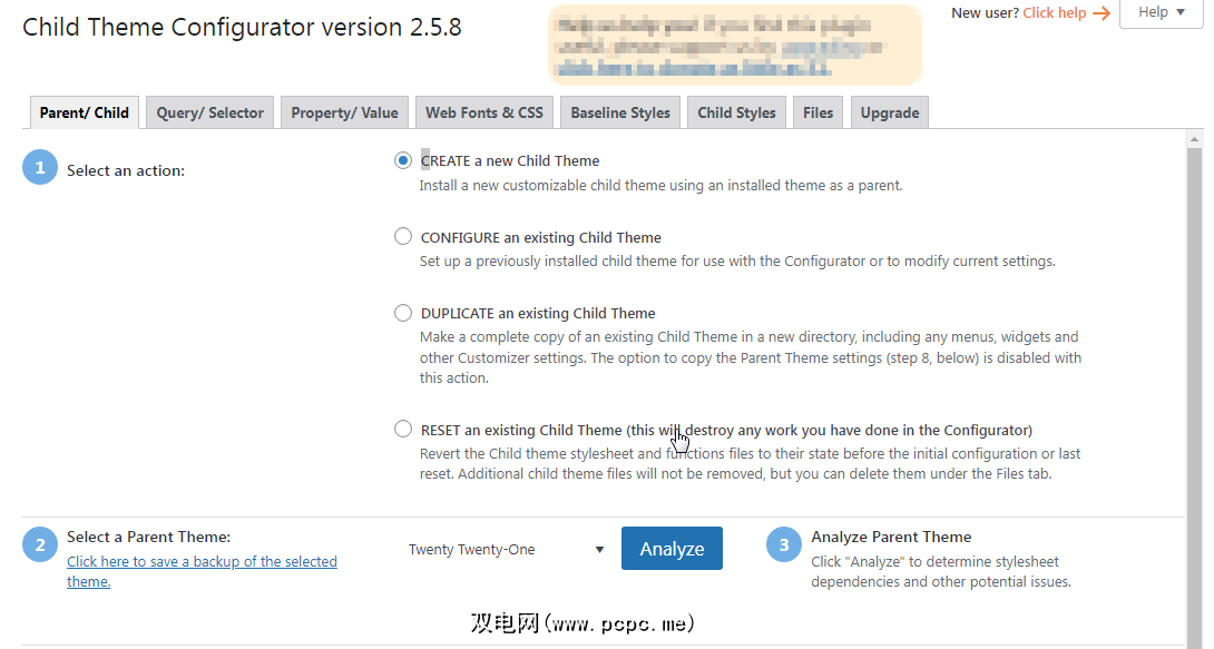 要创建您的子主题,请勾选CREATE a new Child Theme,然后向下滚动并选择父主题。单击分析并等待结果。如果您的所有主题文件都按顺序排列,您将在屏幕上看到其他选项。您可以忽略其中的大部分内容或在适当的情况下进行更改。