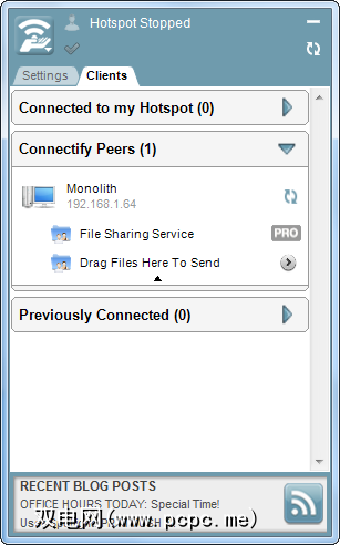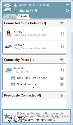 Connectify 3.3还引入了Connectify Peers功能。此列表中将显示在本地网络上运行Connectify的所有计算机,无论它们是否已连接到您的热点。您可以浏览其服务并传输文件。