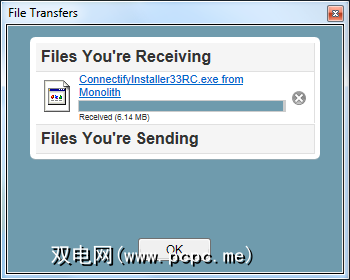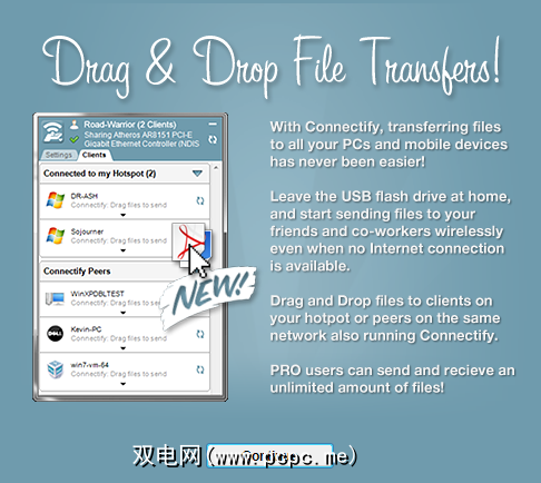 Connectify 3.3中的新增功能是易于使用的拖放功能。 Wi-Fi文件传输功能。将文件拖放到“客户端"窗格中运行Connectify的设备上,Connectify将向它们发送文件。系统会提示他们接受或拒绝文件传输。您可以使用它来传输任何大小的文件,但是Connectify Lite用户每天只能进行一次文件传输。