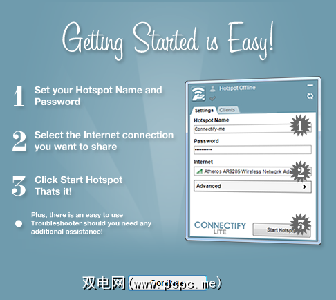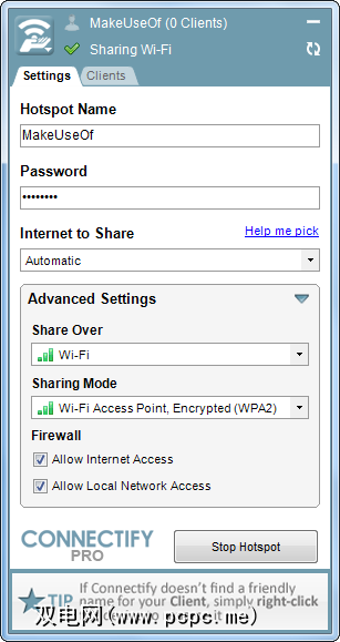 Connectify具有一个简单易用的界面,其中一个选项卡用于配置热点,另一个选项卡用于配置已连接的客户端。在“设置"选项卡中,可以设置热点的名称和密码,选择要共享的Internet连接并启动热点。