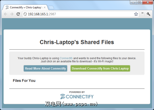 如果另一台设备未运行Connectify,Connectify将为您提供指向的链接。本地网页。另一个用户可以连接到笔记本电脑上运行的网页,然后下载文件。该页面还提供了下载Connectify的链接,因此您以后可以更轻松地发送文件。