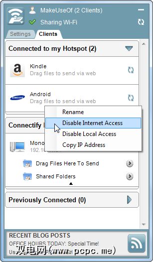 即使您是Connectify Lite用户,也可以右键单击设备以禁用Internet或本地网络访问。如果Connectify没检测到设备的好名字,您也可以使用“重命名"选项来命名设备。