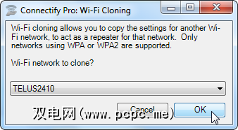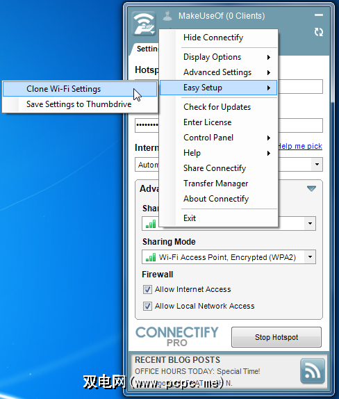 Connectify还可以用作Wi-Fi中继器,从而扩展无线网络的范围。您可以使用它来将Wi-Fi延伸到整个建筑物,甚至延伸到您的后院。单击“ Connectify"菜单按钮,指向“简单设置",然后使用“克隆Wi-Fi设置"选项开始使用。