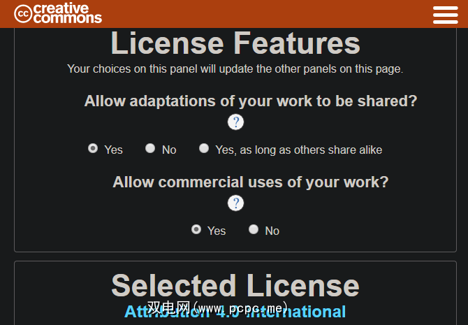 从此处转到“知识共享选择许可证"页面。在这里,您可以回答一些有关如何分配工作的快速问题。这将动态更新页面,以显示与您的选择相匹配的Creative Commons许可证。