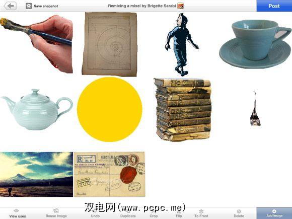 Mixel由一块空白画布组成,您可以在其中添加从Mixel库,您自己的iPad照片库,您的Facebook照片或从网络图像搜索中选择的图像。如果您有iPad 2,还可以拍摄照片并将其添加到“ mixel"中。您可以使用Mixel创建可以与其他Mixel用户共享的拼贴。