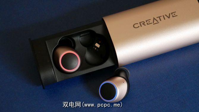 Creative Outlier Gold真正的无线耳机来了由黑色塑料和香槟金色铝制成的紧凑型表壳。机箱的USB-C充电端口和状态指示灯位于左侧。