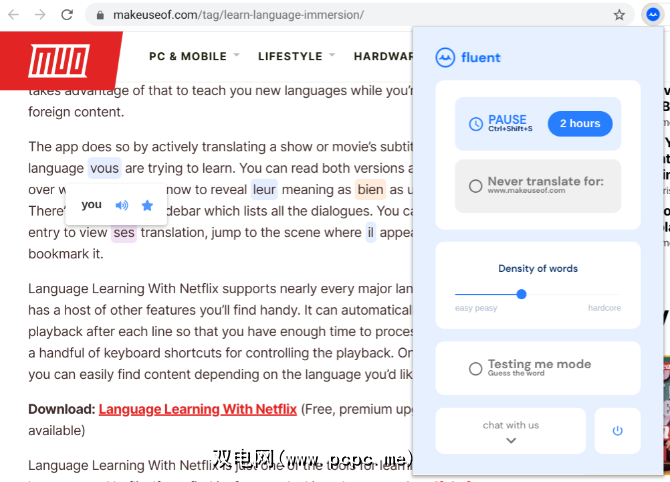在任何时候,您都可以切换Fluent来暂停或恢复它,包括定时暂停。您还可以调整设置,以使扩展程序不会在重要网站(例如Google文档或您的网上银行帐户)上激活。您也可以手动将某些网站列入白名单。选择一个难度级别,告诉Fluent应该如何积极地翻译单词。