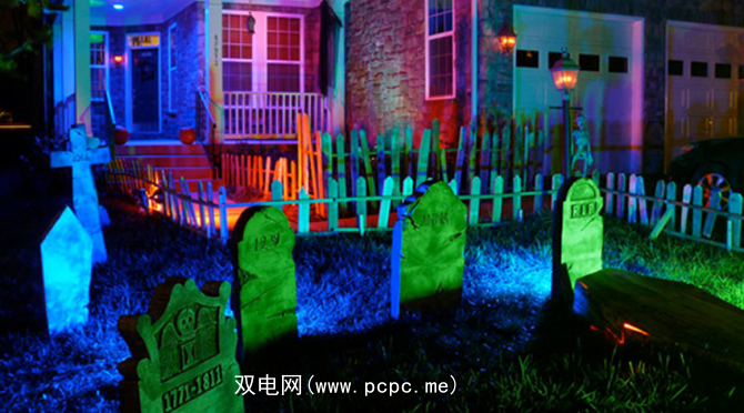 便宜的LED照明的到来,在万圣节之夜换上灯泡的成本几乎为零,这使怪异的巢穴变得尤为重要欢迎房子。只需一个低至1美元的彩色LED灯泡,您就可以轻松地将它们安装在建筑物的整个正面。