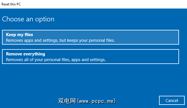 要使用系统还原工具,请转到设置>更新和安全性>恢复>重置此PC>使用入门>保留文件,然后按照屏幕上的说明进行操作。