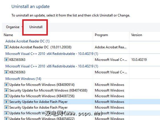 要卸载更新,请打开设置应用,然后转到更新和安全性> Windows更新>更新历史记录>卸载更新。突出显示要从系统中删除的更新,然后单击窗口顶部的卸载按钮。