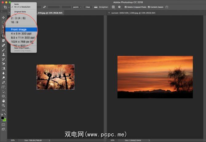 您可以使用裁剪功能快速将两个长宽比不同的两个文档裁剪为相同大小工具。这是最快的方法,无需比较两张照片的图像大小。