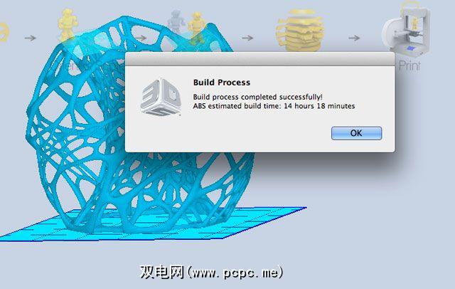 一旦准备就绪,构建按钮会创建一个准备打印的文件,并为您提供时间估算;这些可以直接通过WiFi发送,也可以保存到USB记忆棒以通过设备本身进行打印。我的第二张照片-在深色仿生灯罩下发光-估计在14小时左右。