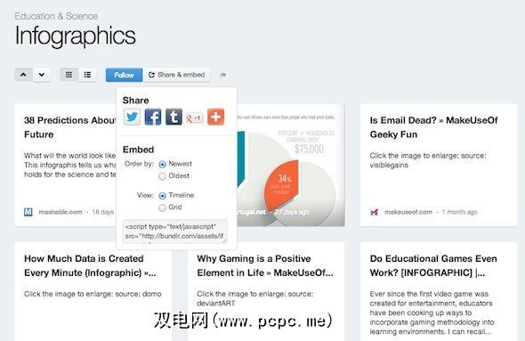创建捆绑包后,您可以嵌入它们,通过生成嵌入代码,以网格或列表的形式显示在您的网站上。 Bundlr的有趣之处在于,您不需要时就不必嵌入收藏,只需通过Facebook,Twitter或其他方式共享链接即可。
