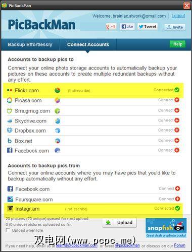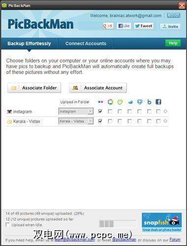 您的在线社交帐户(如Facebook,Instagram和Foursquare)将遵循相同的过程。选中该复选框,可以使PicBackMan仅在计算机空闲时上传。上传完成后,会弹出一个气球提示通知您失败的消息。