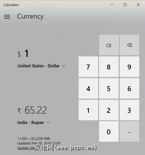 货币转换器是随 Windows 10 Fall Creators Update 版本引入的。几乎所有主要货币都可以使用货币转换。