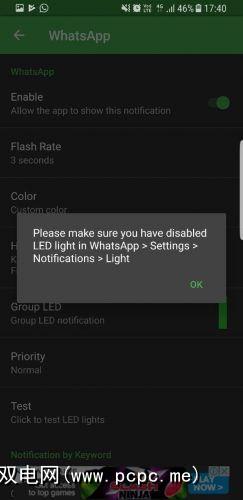 如果某些应用与这些权限发生冲突,Light Manager还将提示您停用相关应用的LED通知。事实证明,Whatsapp就是这种情况。