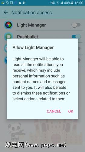 打开Light Manager时,应用程序将提示您执行此操作。您只需在Android通知菜单中启用该应用即可。
