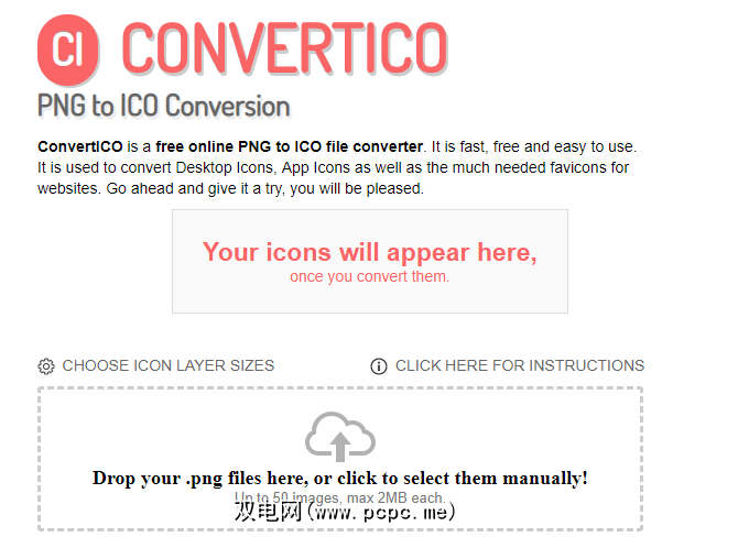 ConvertICO提供了一种简便的方法。您一次最多可以上传50张PNG图片,以将其转换为ICO格式。如果愿意,还可以输入要转换的图像的URL,从而省去了下载PNG的中间步骤。