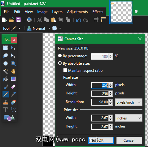 打开图像编辑器(我们使用Paint.NET)并创建完美正方形的画布-256×256即可使用。按 Ctrl + A 选择整个图像,然后按 Del 删除它。当另存为PNG时,这将创建一个透明的正方形。